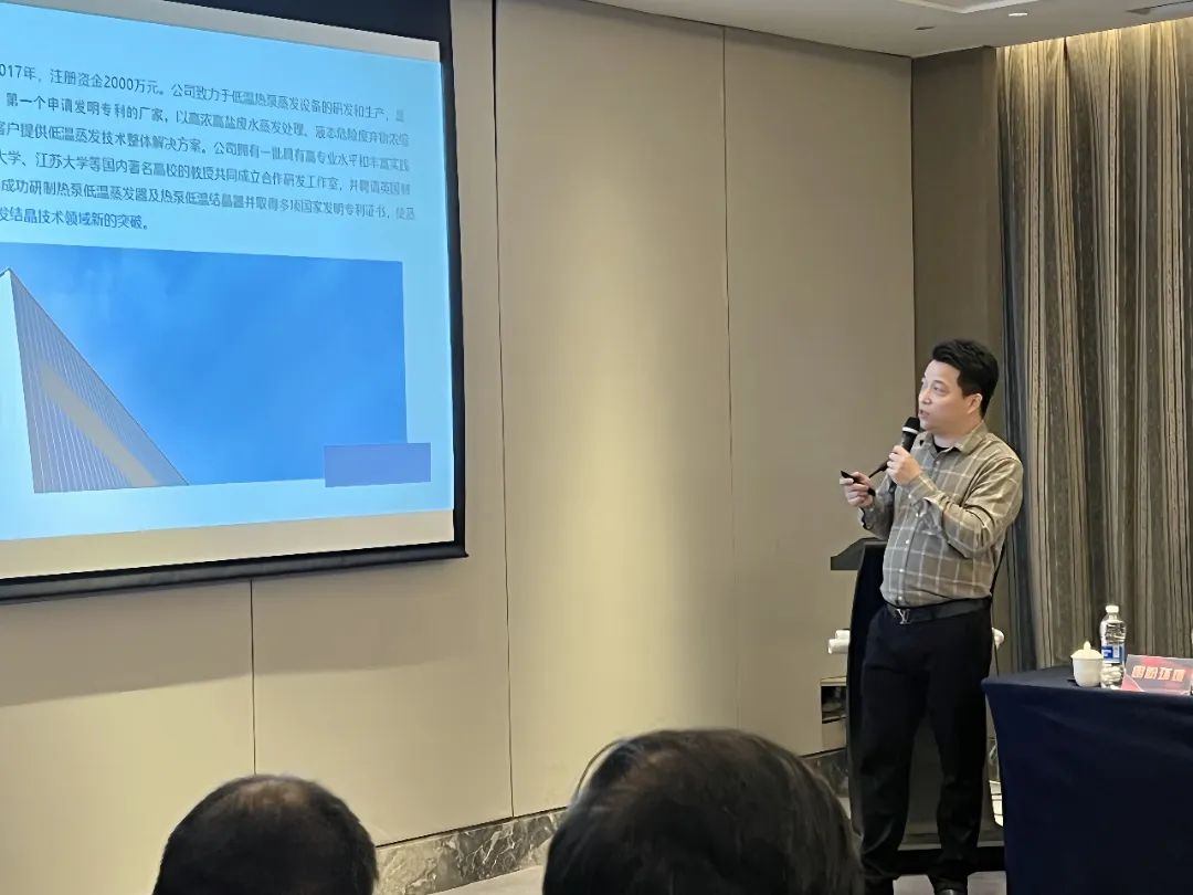 會(huì)議中由總經(jīng)理鮑天鈞為主講,他面向?qū)<翌I(lǐng)導(dǎo)鑒定委員全體成員企業(yè)發(fā)展以及朗盼的低溫?zé)岜谜婵照舭l(fā)系列的產(chǎn)品進(jìn)行了系統(tǒng)化的介紹。他表示朗盼環(huán)境致力于低溫?zé)岜谜舭l(fā)設(shè)備的研發(fā)和生產(chǎn),以高濃高鹽廢水蒸發(fā)處理、液態(tài)危險(xiǎn)廢棄物濃縮減量和物料資源化回收為主營(yíng)業(yè)務(wù),為客戶(hù)提供低溫蒸發(fā)技術(shù)整體解決方案。公司擁有一批具有高專(zhuān)業(yè)水平和豐富實(shí)踐經(jīng)驗(yàn)的管理人才,與東南大學(xué)、華東理工大學(xué)、江蘇大學(xué)、河海大學(xué)等國(guó)內(nèi)著 名學(xué)府的教授共同成立合作研發(fā)工作室,并聘請(qǐng)英國(guó)制冷協(xié)會(huì)專(zhuān)家作為顧問(wèn),成功研制熱泵低溫蒸發(fā)器及熱泵低溫結(jié)晶器并取得了三十余項(xiàng)國(guó) 家專(zhuān)利及實(shí)用新型專(zhuān)利,使蒸發(fā)結(jié)晶擺脫了高溫?zé)嵩吹南拗?,?shí)現(xiàn)蒸發(fā)結(jié)晶技術(shù)領(lǐng)域新的突破。